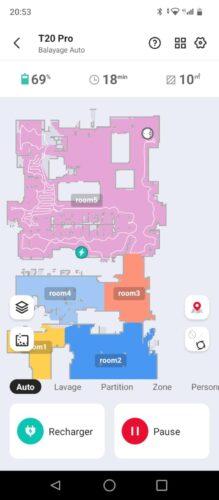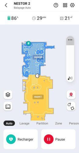 Un robot silencieux . Le nettoyage n’est pas efficace au niveau du lavage . Des qu ‘il y a une tache il n’arrive pas a la faire disparaitre Cartographie fait rapidement avec division des zones nettoyer. Pas facile l’application. Je ne comprends pas comment faire le lavage du sol seulement dans zones. Le robot au retour à la base pour la recharge ne trouve pas tout de suite le chemin.