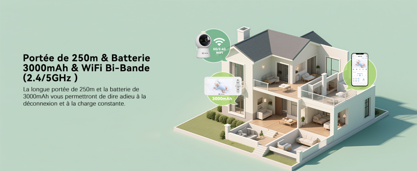 Elle prend en charge la connectivité Wi-Fi bi-bande 2,4 G/5 G et intègre la détection des visages masqués, le suivi automatique des mouvements et la détection des pleurs, ce qui en fait un appareil intelligent et fiable.
