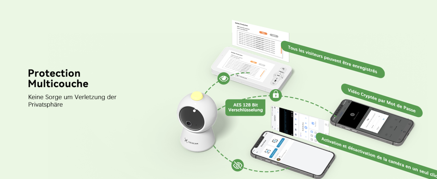 La sécurité des données est une priorité. Le babyphone Cococam Baby 10Q est équipé d’un cryptage AES 128 bits pour prévenir tout piratage. Les modes de confidentialité de l’objectif (marche/arrêt/minuterie) contrôlés par l’application garantissent la sécurité de votre famille.