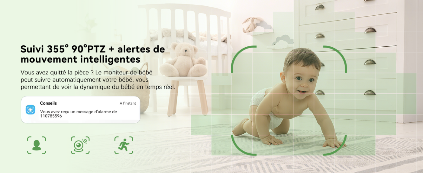 La caméra dispose d’une rotation PTZ 355° horizontale et 90° verticale avec suivi automatique. Elle suit automatiquement bébé qui bouge, rampe ou se déplace dans son lit, détectant les dangers à temps. Plus besoin d’ajuster manuellement l’orientation : la caméra s’occupe de tout.