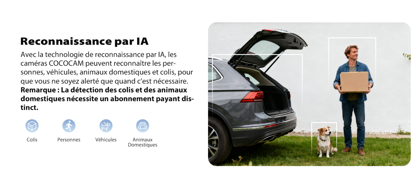 La caméra WiFi Cococam 4K embarque une intelligence artificielle capable de distinguer différents types de mouvements. La détection humaine et véhicules est incluse gratuitement, réduisant considérablement les fausses alertes dues aux feuilles ou aux ombres.